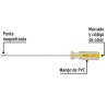 • Su mango de PVC proporciona durabilidad y un agarre cómodo, mientras que su diseño hexagonal evita que la herramienta ruede cuando se coloca sobre superficies planas. El sistema de marcado con código de color permite identificar fácilmente la medida y el tipo de punta, mejorando la organización y rapidez en la selección de la herramienta