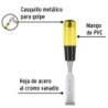 • El mango de PVC ergonómico asegura un agarre cómodo y firme, ideal para sesiones prolongadas de trabajo. Además, incluye un casquillo metálico que permite el uso con mazo, sin comprometer la integridad del mango. Para mayor seguridad y conservación, incorpora una tapa que protege el filo cuando no está en uso