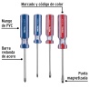 • Cada mango está fabricado en PVC y diseñado con forma hexagonal para evitar que la herramienta ruede al dejarla sobre superficies planas. Además, el sistema de marcado con código de color permite identificar fácilmente la medida y el tipo de punta, optimizando la organización y selección de herramientas