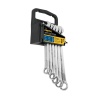 • Las llaves están fabricadas en acero al cromo vanadio, lo que les otorga una excelente resistencia y durabilidad. Cada una tiene la medida marcada para una identificación rápida y sencilla. El juego incluye un práctico estuche organizador que facilita el almacenamiento y transporte de las llaves. Cada llave combina una boca fija en un extremo y una boca de anillo en el otro, lo que las hace versátiles y adecuadas para diversas aplicaciones. Además, su acabado cromado brillante no solo mejora su apariencia, sino que también proporciona una mayor resistencia a la corrosión, asegurando una mayor vida útil.