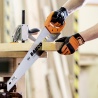 • Con una configuración de entre 7 y 8 dientes por pulgada, proporciona cortes limpios y eficientes en distintos tipos de madera. El mango bi-componente de plástico, atornillado y ergonómico, asegura un agarre cómodo y firme, y puede utilizarse como guía para marcar ángulos de 45° y 90°, lo que resulta muy práctico en proyectos de carpintería